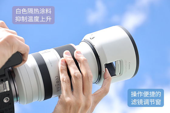 RF鏡頭中首款白色鏡頭,采用了白色隔熱涂料,在炎炎烈日下,長(zhǎng)時(shí)間拍攝也能抑制鏡頭溫度的上升。附帶的鏡頭遮光罩ET-83F(W III)也采用了與鏡身相同的白色涂裝,增加了與鏡頭的融合感。此外,遮光罩帶有滑動(dòng)式的圓形偏光濾鏡調(diào)節(jié)窗,在使用偏光濾鏡等拍攝時(shí),無須取下遮光罩便可輕松進(jìn)行調(diào)節(jié),提高了拍攝效率。