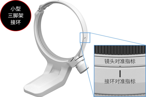 為了配合長(zhǎng)度大幅縮短,鏡身小型化的鏡頭,佳能新開發(fā)了小型三腳架接環(huán)。三腳架接環(huán)的安裝簡(jiǎn)單便捷,安裝在鏡頭上也不會(huì)影響到鏡頭小型化的特點(diǎn)。不僅如此,當(dāng)安裝在三腳架上進(jìn)行拍攝時(shí),可以參考接環(huán)上的對(duì)準(zhǔn)指標(biāo),將鏡頭指標(biāo)與之對(duì)準(zhǔn),從而輕松切換縱向與橫向構(gòu)圖。